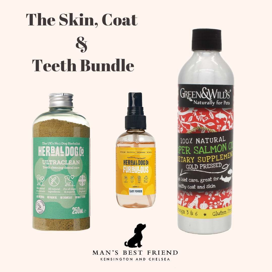 Give your pup a head-to-paw glow up with our Skin, Teeth & Coat Bundle! We've paired our All Natural Plaque Protection with our Baby Powder Cologne & our Super Salmon Oil to keep your pup looking, smelling and feeling fresh inside and out!