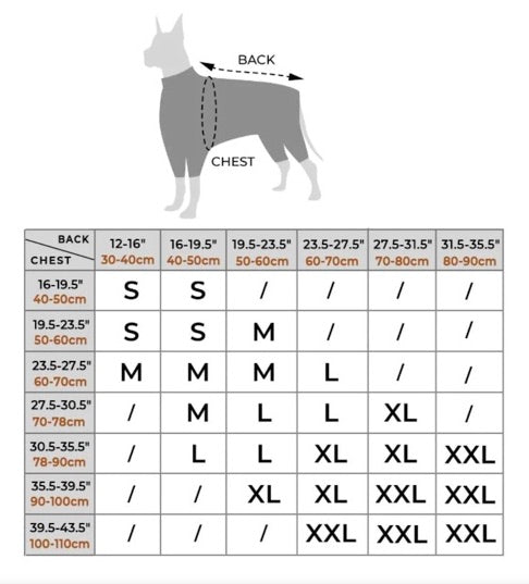 See images for sizing guidelines and how to measure your pup for The Ultimate Waterproof Dog Suit.